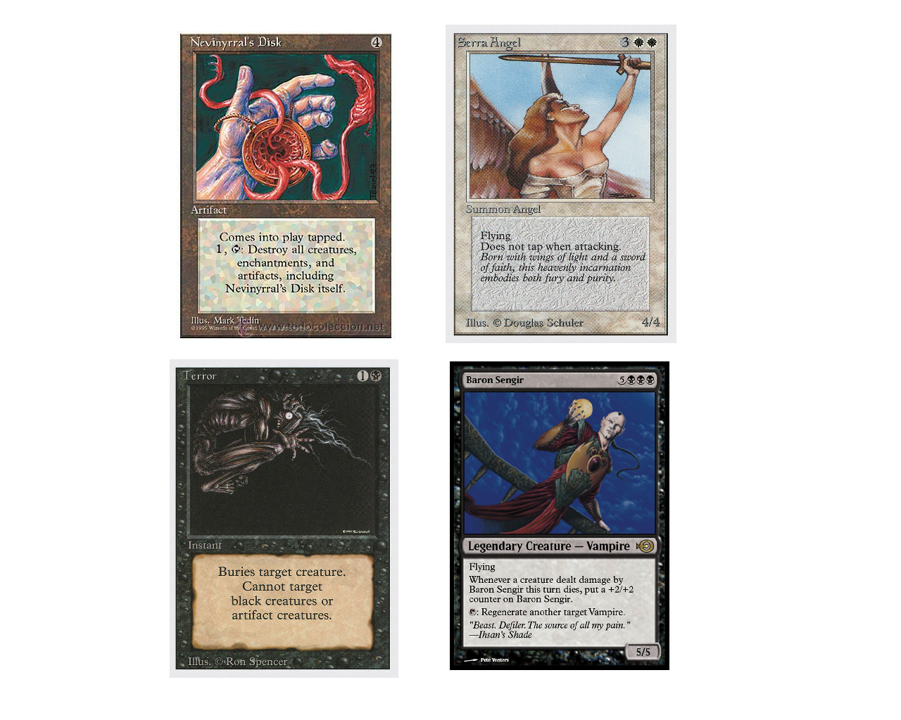 Finalmente, no quisiera dejar sin mencionar algunas de las fabulosas y acertadas ilustraciones que acompañan a todas las cartas, así como las citas que en ocasiones ayudan a configurar la criatura o el artefacto en concreto, que para mí constituyen buena parte del aroma que envuelve este universo y que viene siempre a mi mente cuando lo rememoro. Cartas como Serra Angel o Baron Sengir son, a mi juicio, muy buenas muestras de ese estilo tan único que hizo de MTG un fenómeno tan popular.